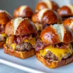 Bacon Cheeseburger Pretzel Sliders are a delicious combination of savory bacon, melted cheese, and juicy beef patties, all nestled in soft pretzel buns.