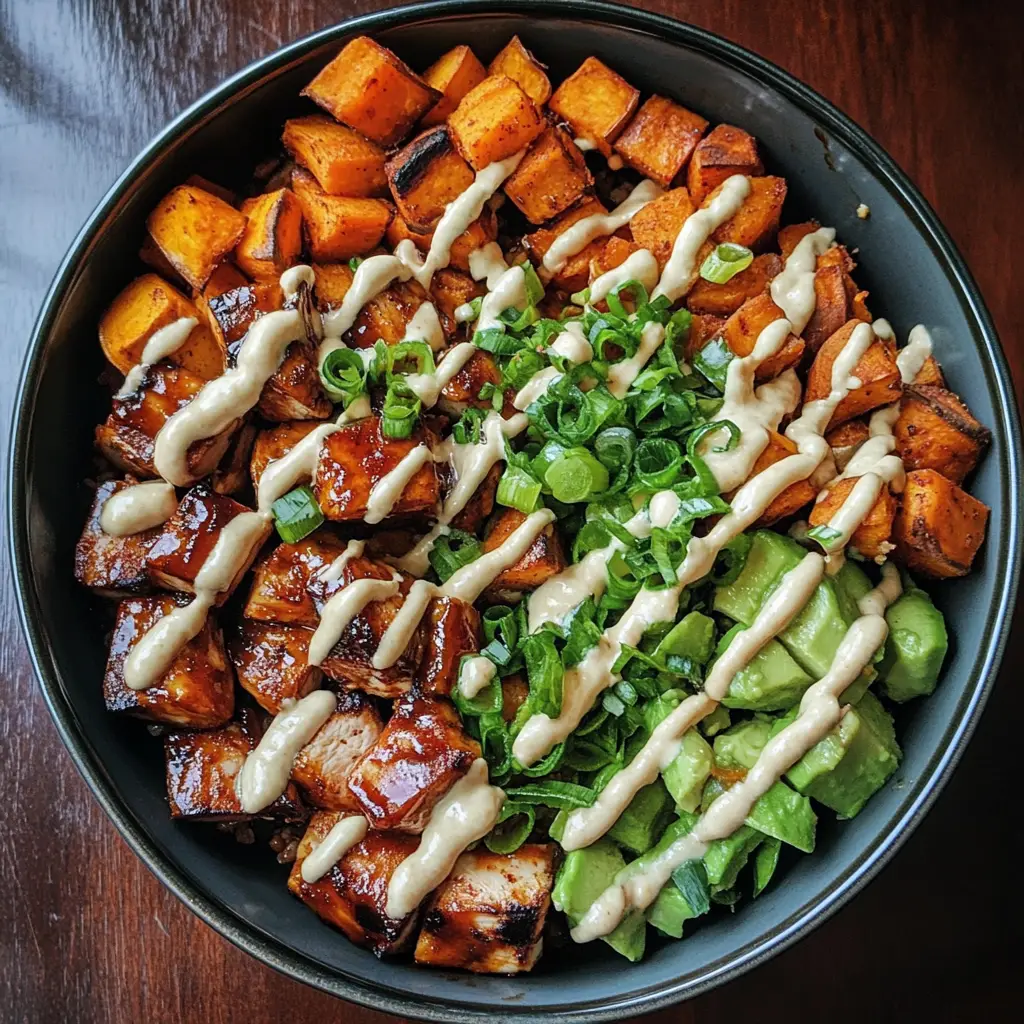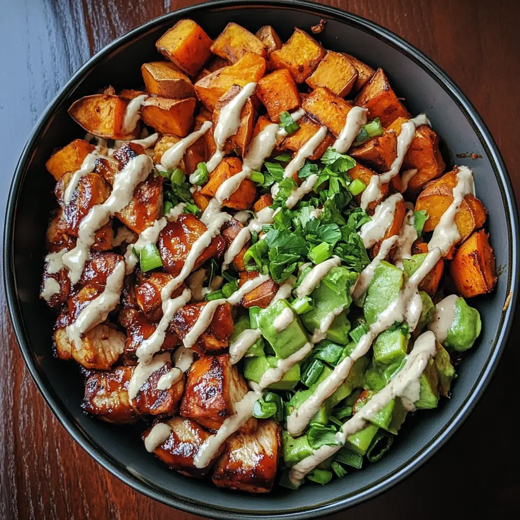 A delicious and healthy BBQ Chicken Sweet Potato Bowl that combines tender chicken, sweet potatoes, and a tangy BBQ sauce for a satisfying meal.