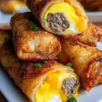 Start your day with these savory breakfast egg rolls filled with sausage, eggs, cheese, and hash browns, all wrapped in a crispy shell.