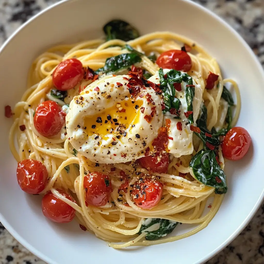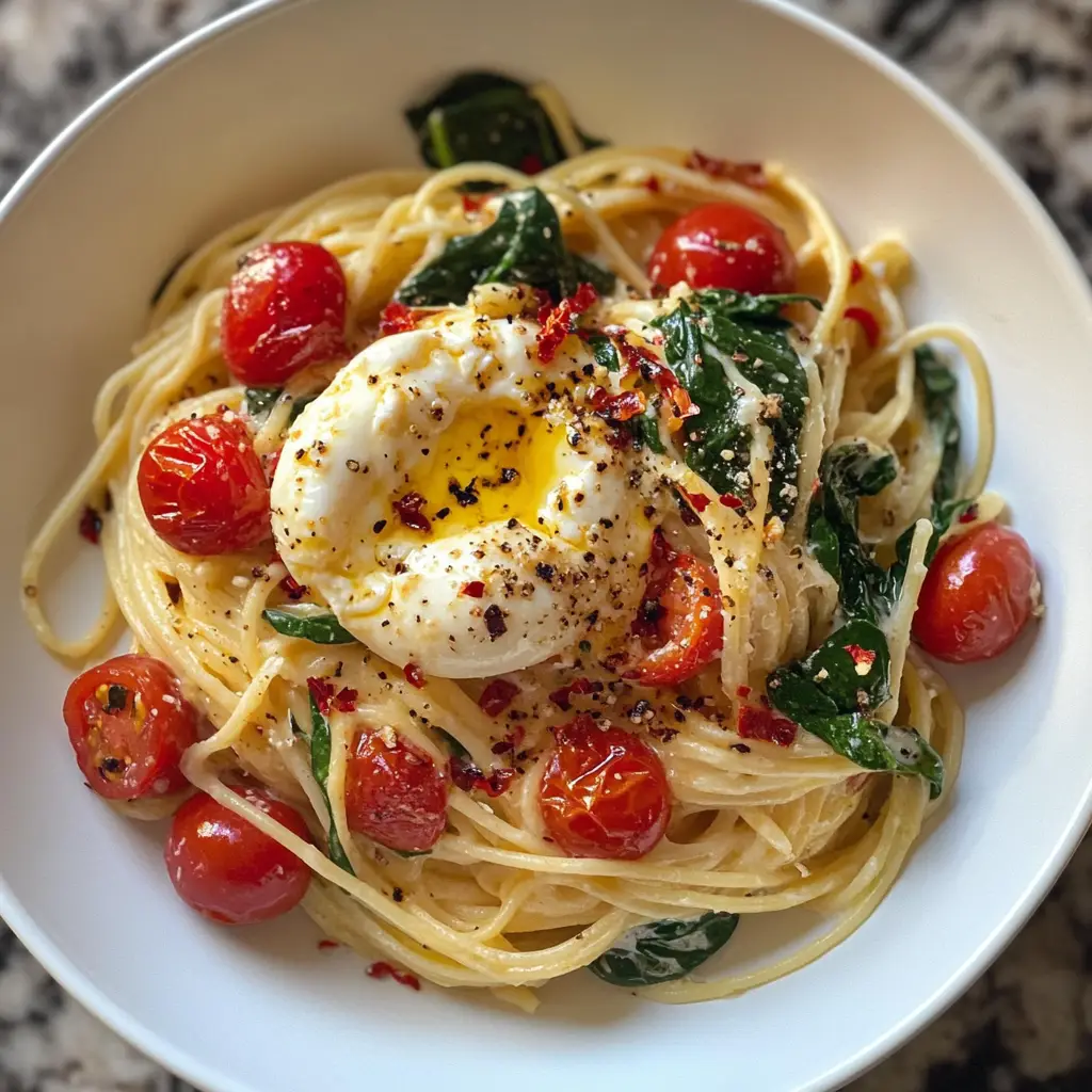 A creamy and flavorful pasta dish featuring burrata cheese, fresh cherry tomatoes, and spinach, perfect for a quick and satisfying meal.
