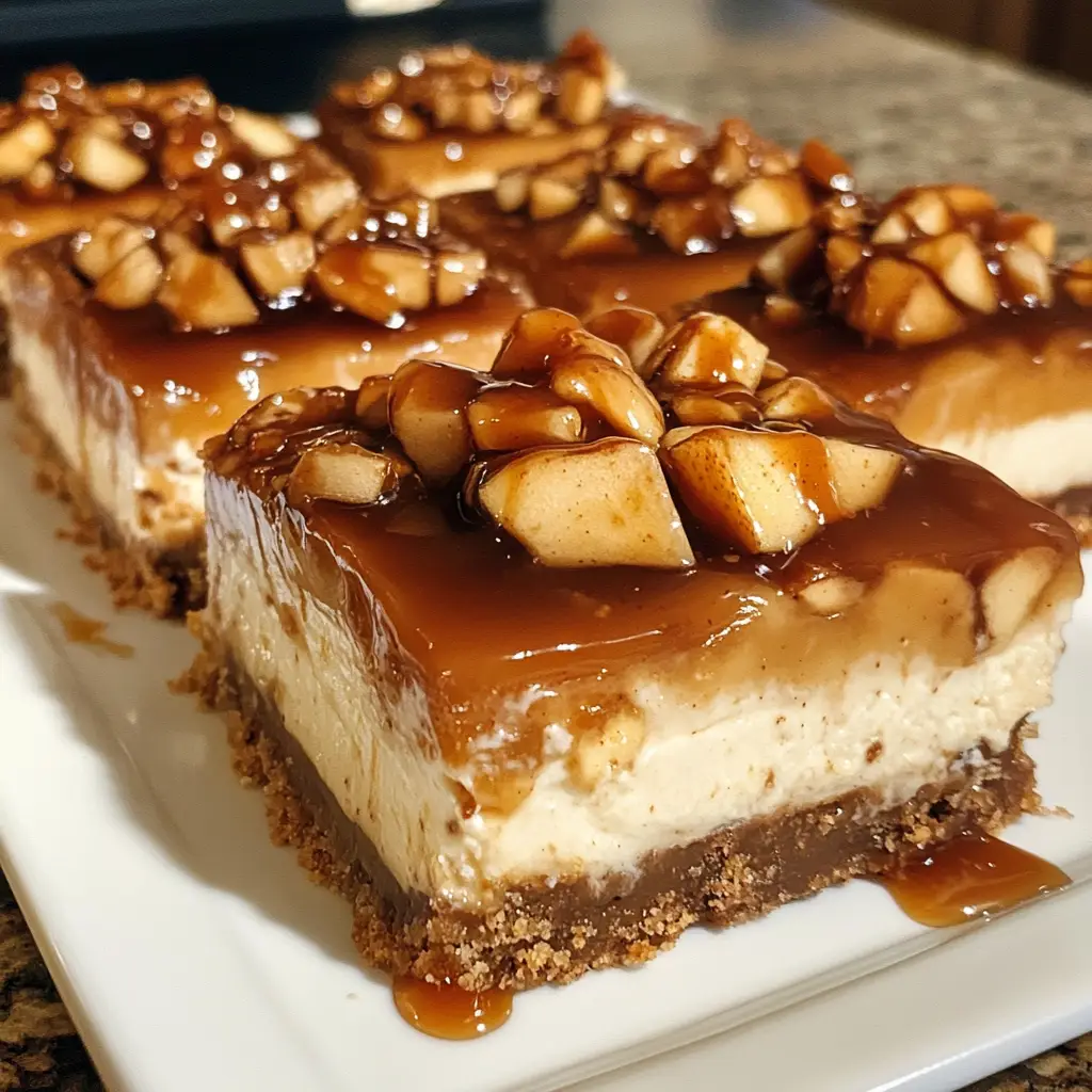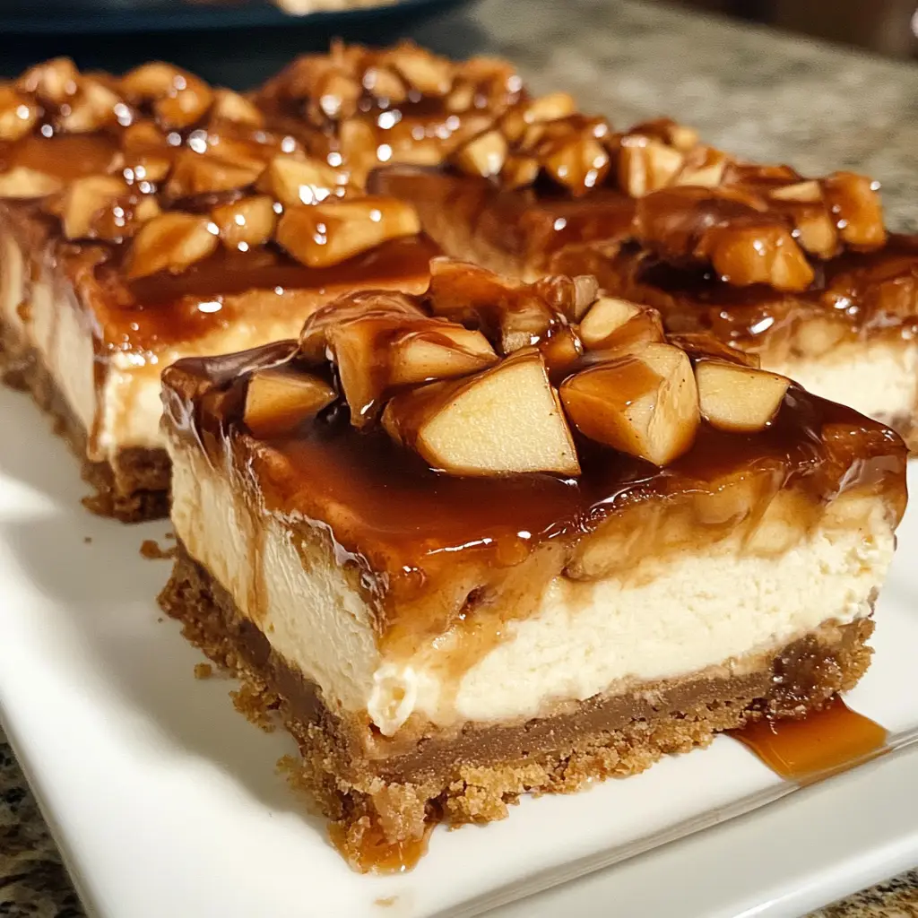 Delicious caramel apple cheesecake bars that combine the flavors of creamy cheesecake, sweet caramel, and tart apples for a delightful dessert.