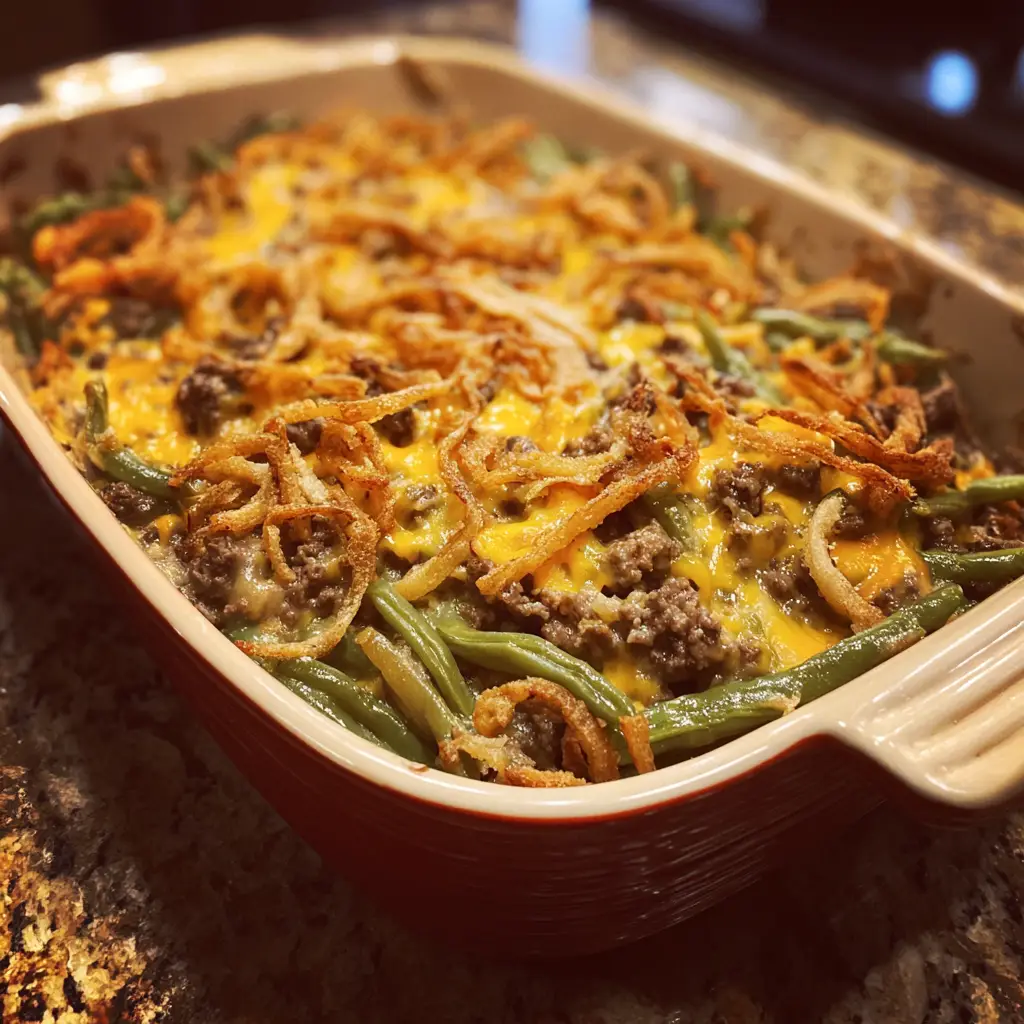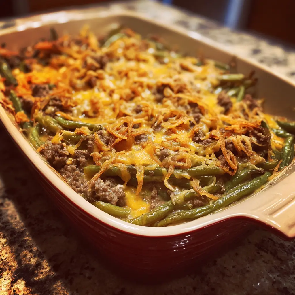 A delicious and comforting casserole made with ground beef, green beans, and a cheesy sauce, perfect for family dinners.