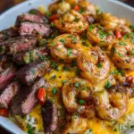 Imagine walking into your kitchen, a warm and inviting aroma swirling around you—the irresistible scent of perfectly seared steak mingling with the buttery touch of sautéed shrimp. You can almost hear the sizzle as the steak takes on a golden-brown crust, calling your name as it caramelizes under the heat. The vibrant colors of fresh, diced bell peppers and onions brighten your space, creating an atmosphere bursting with flavor. This is not just a simple meal; this is a celebration on a plate, a moment in time filled with indulgence and satisfaction.
