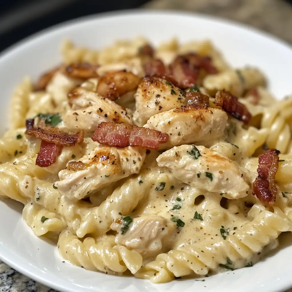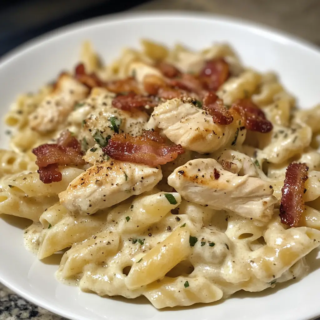 A delicious and easy-to-make pasta dish featuring chicken, bacon, and ranch dressing, perfect for a quick dinner.
