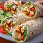 A flavorful Chicken Shawarma Wrap filled with juicy marinated chicken, crisp veggies, and a creamy sauce, wrapped in warm flatbread.