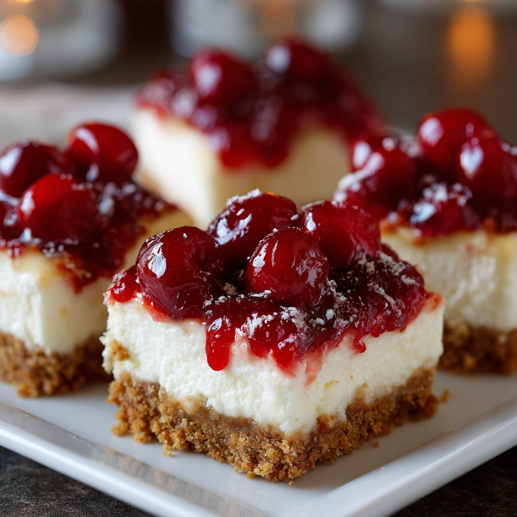 Delicious and festive cheesecake bars topped with cherry filling, perfect for Christmas gatherings.
