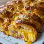 A delicious Croissant Bake Breakfast Casserole featuring buttery croissant pieces, savory deli meat, and creamy cheese, baked in a custardy egg mixture.