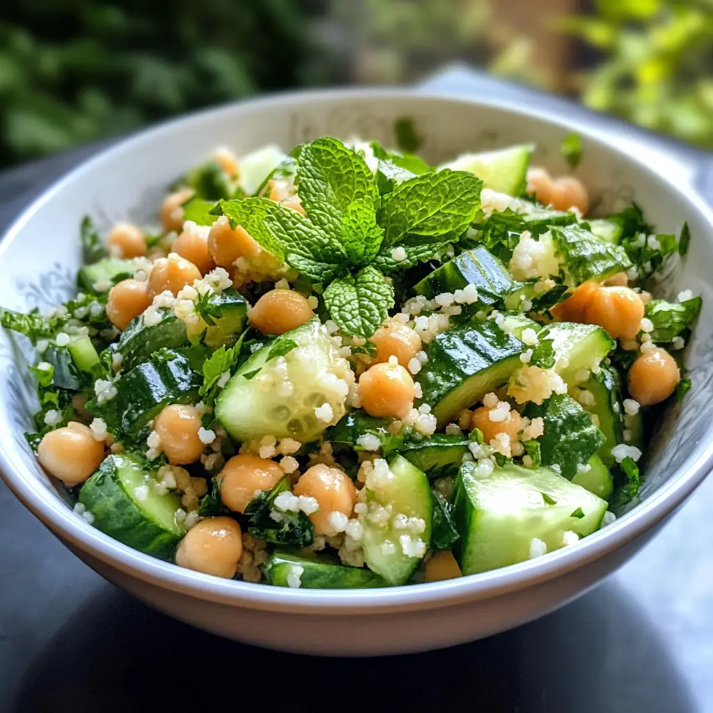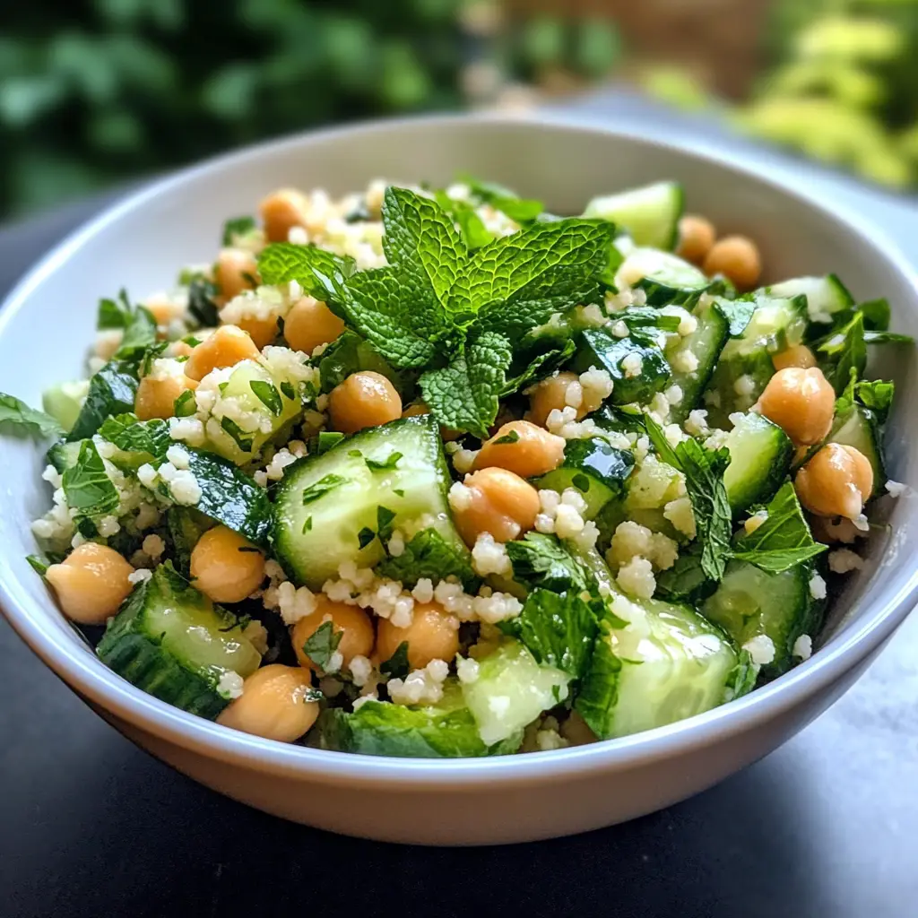 A refreshing salad made with couscous, cucumbers, mint, and chickpeas, perfect for a light meal or side dish.