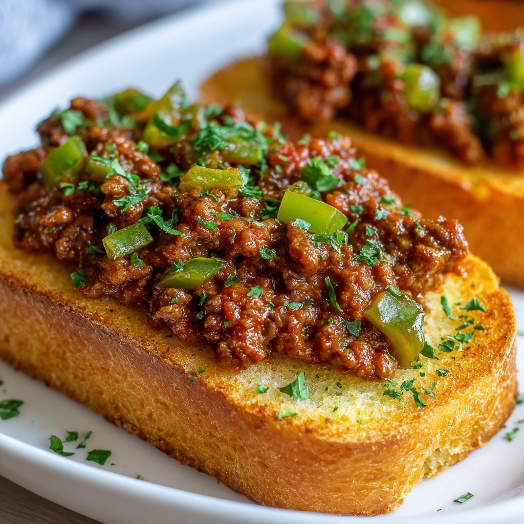 Frisco Melt Sloppy Joes on Garlic Bread is a delicious twist on the classic sloppy joe, featuring a savory beef mixture served on toasted garlic bread, topped with melted cheese.