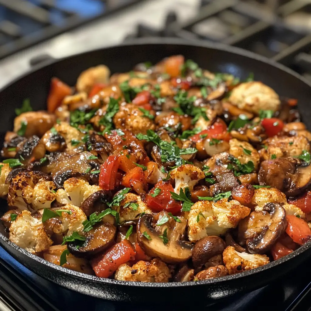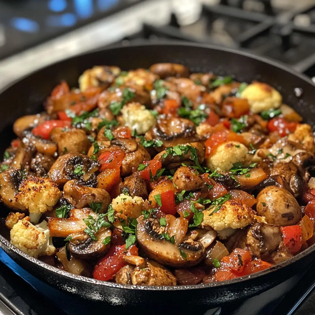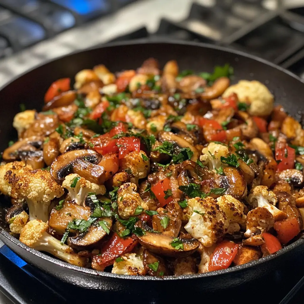 A delicious and healthy skillet dish featuring garlic, cauliflower, and mushrooms, perfect for a quick meal.