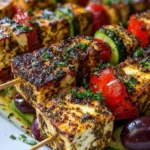 Savor the vibrant flavors of grilled za’atar tofu skewers, perfectly charred and bursting with aromatic herbs and colorful vegetables.