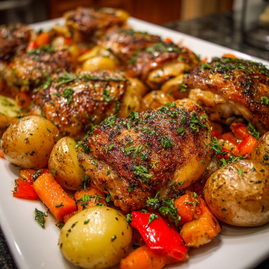 Herb-Roasted Chicken Thighs with Potatoes & Veggies Delight!