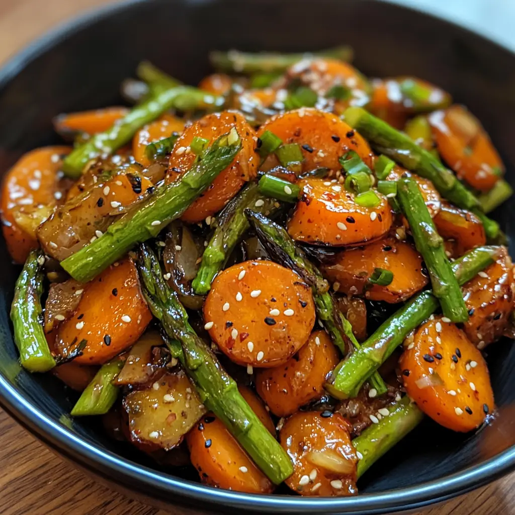 A delicious and healthy stir-fry featuring honey glazed carrots and asparagus, perfect as a side dish or a light meal.