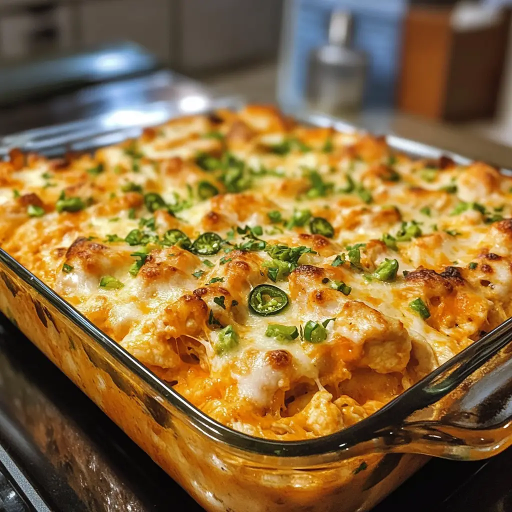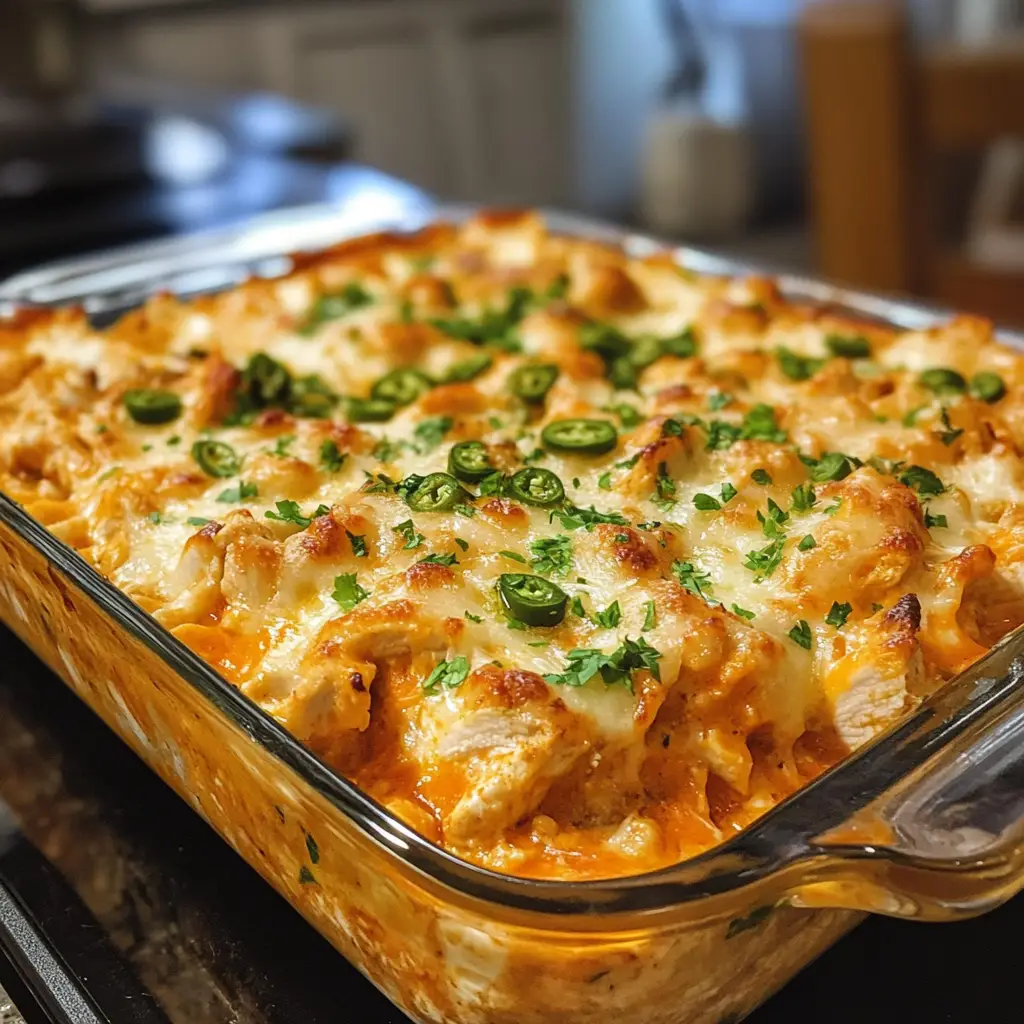 A spicy and savory casserole combining tender chicken, zesty buffalo sauce, and jalapeños for a flavor-packed meal.