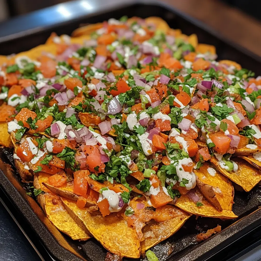 Loaded Sweet Potato Nachos are a delicious and healthy twist on traditional nachos, featuring crispy sweet potato slices topped with a variety of flavorful ingredients.