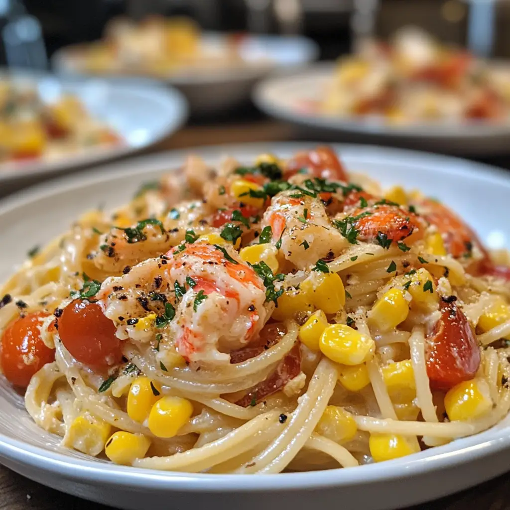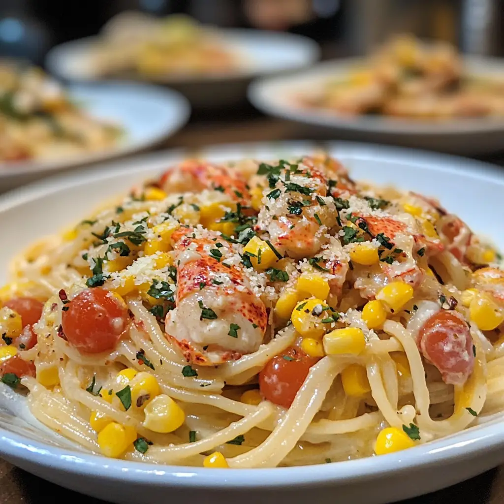A delicious and flavorful lobster pasta dish featuring sweet corn and ripe tomatoes, perfect for a special occasion or a comforting meal.