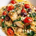 A vibrant and delicious dish featuring angel hair pasta, juicy marinated chicken, cherry tomatoes, olives, and fresh spinach, all brightened with lemon juice.
