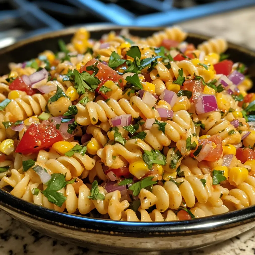 A delicious and vibrant pasta salad inspired by the flavors of Mexican street corn, featuring a mix of pasta, corn, and zesty seasonings.