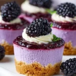 Delightful mini cheesecakes featuring a creamy filling of blackberries and lavender, resting on a buttery graham cracker crust.