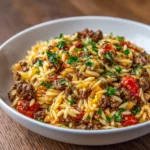 A delicious and easy one-pan meal featuring ground beef and orzo pasta, baked to perfection.
