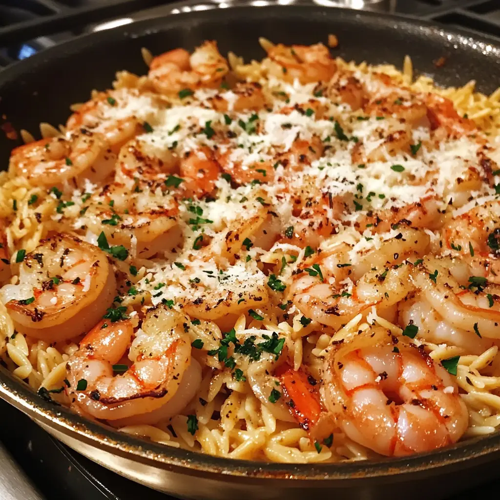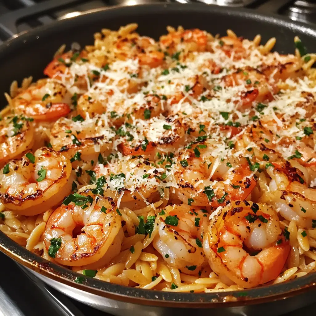 A delicious and easy one-pan dish featuring creamy parmesan orzo and succulent shrimp, perfect for a quick weeknight dinner.