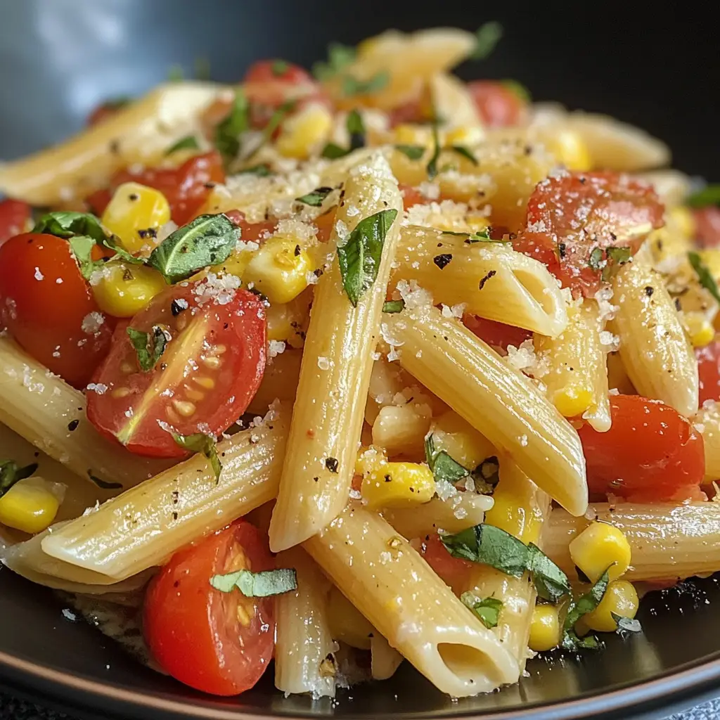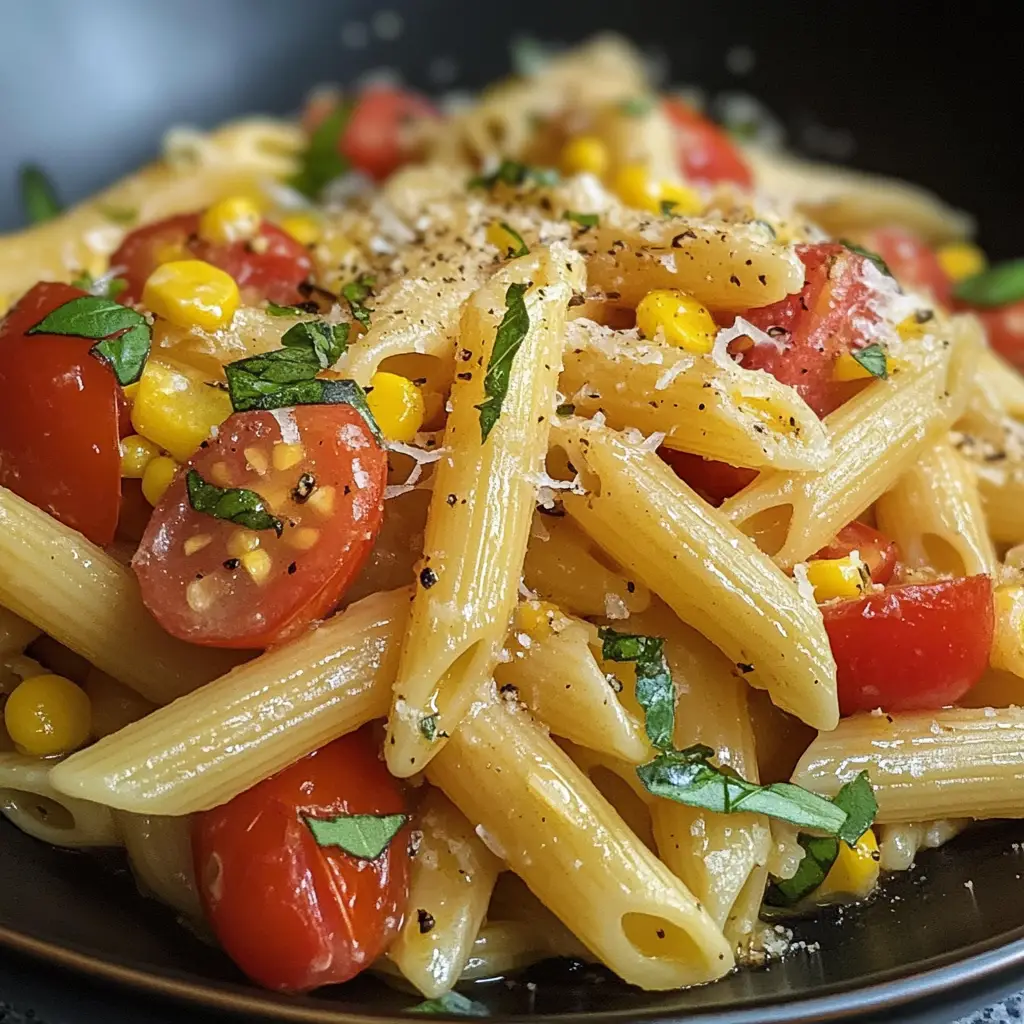 A refreshing and vibrant pasta dish featuring fresh tomatoes and sweet corn, perfect for summer.