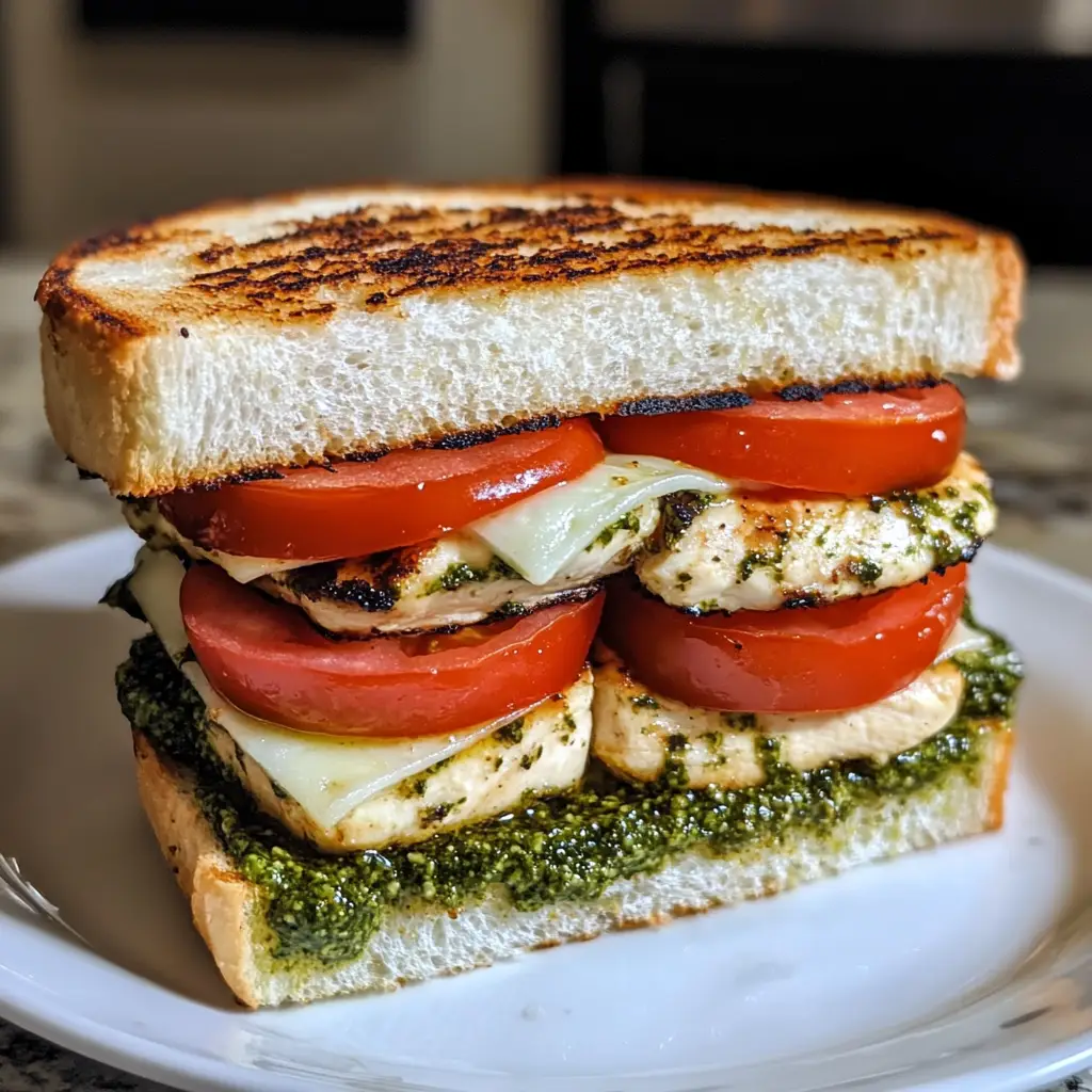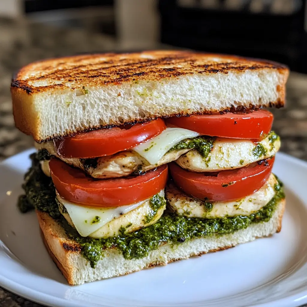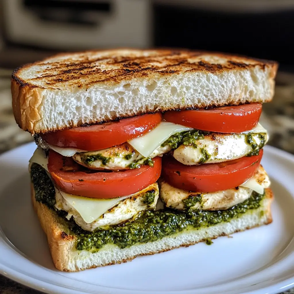 A delicious sandwich featuring grilled chicken, fresh mozzarella, tomatoes, and basil pesto, perfect for a quick lunch or dinner.