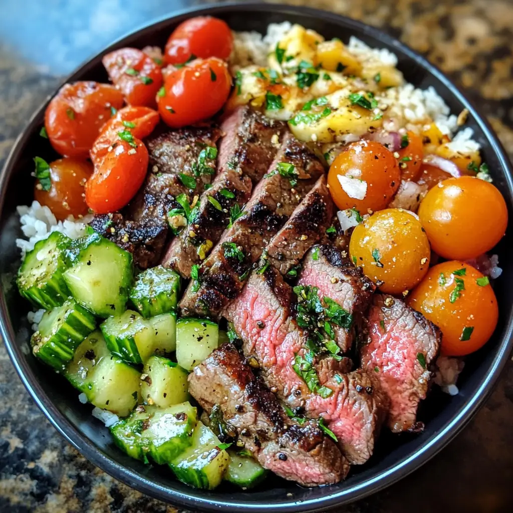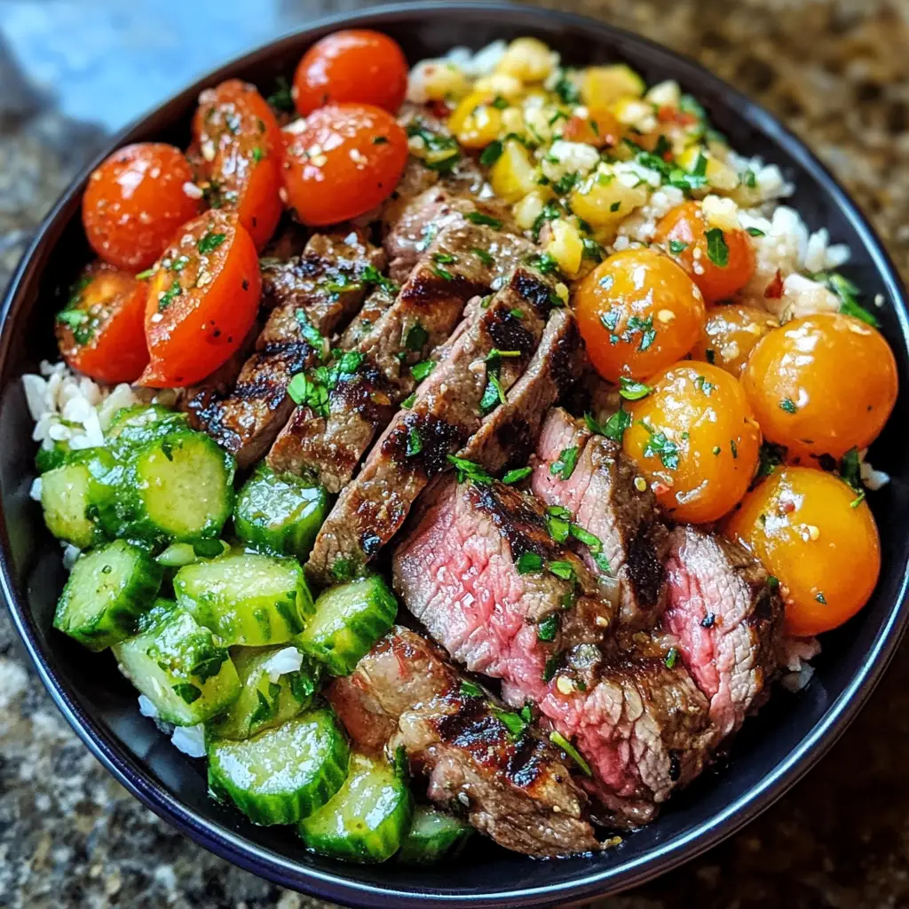 A delicious and easy-to-make Mediterranean steak bowl that combines tender steak with fresh vegetables and flavorful toppings.