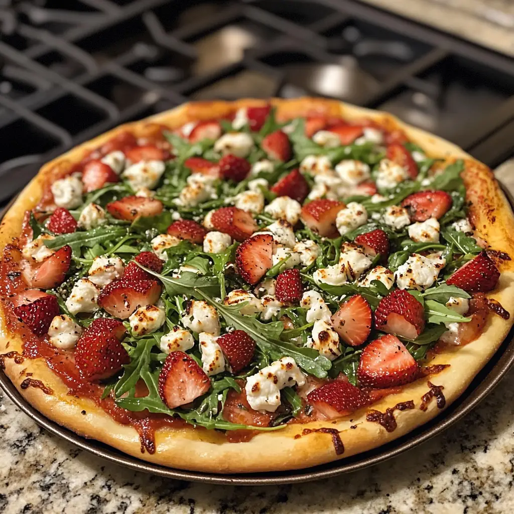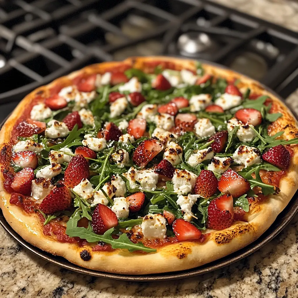 A delicious and unique pizza topped with fresh strawberries, peppery arugula, and creamy goat cheese, perfect for a summer meal.