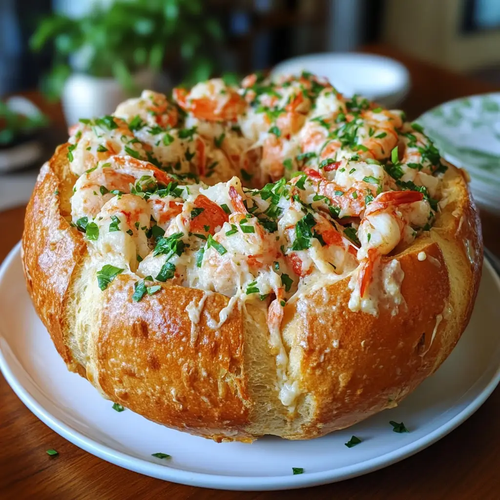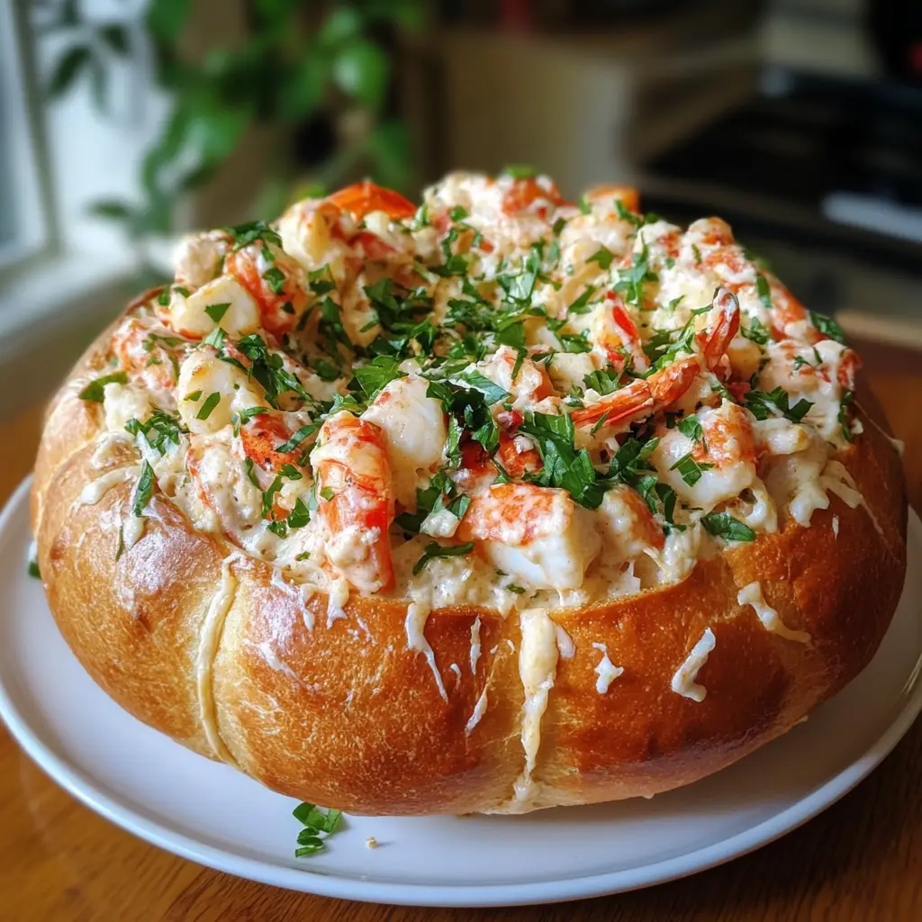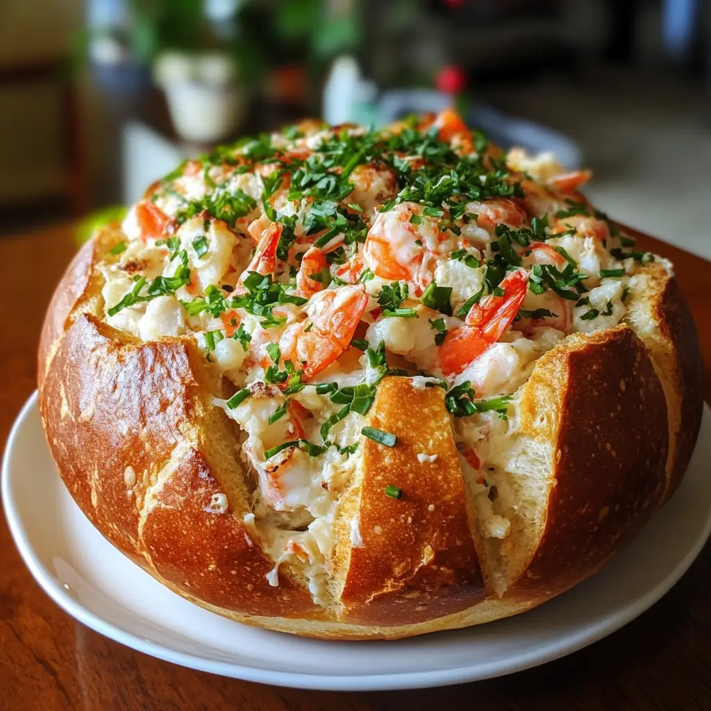 A delightful and savory stuffed seafood bread bowl filled with a mix of fresh seafood and creamy ingredients, perfect for any occasion.