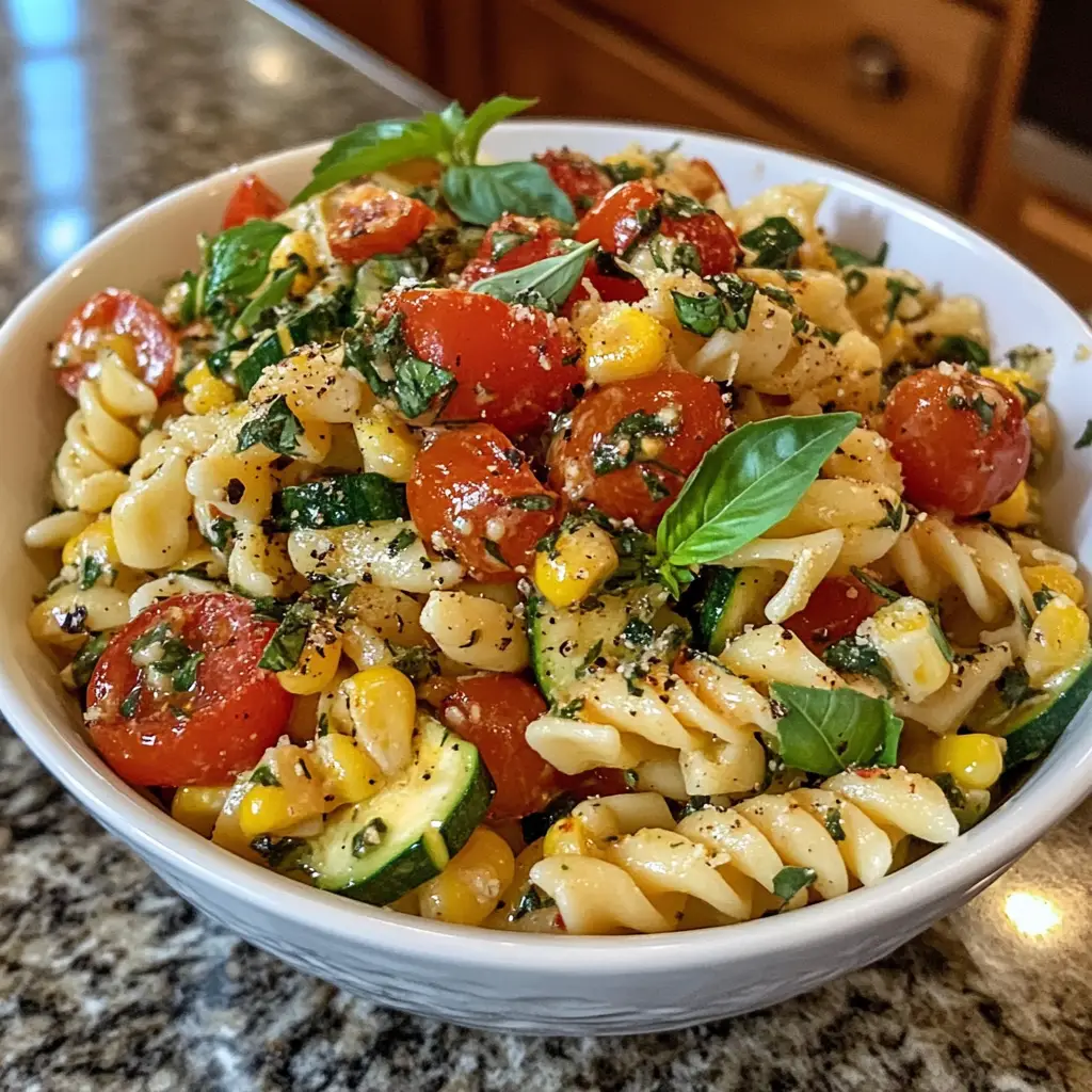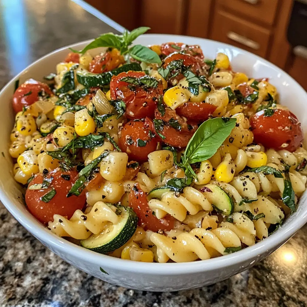 A refreshing summer dish featuring cavatelli pasta tossed with sweet corn, ripe tomatoes, and zucchini, perfect for warm weather dining.