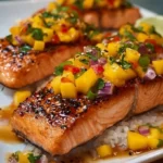 Once the salmon reaches your desired level of doneness, top each fillet with a generous spoonful of the refreshing mango salsa, letting the juices blend together, creating a harmonious flavor.